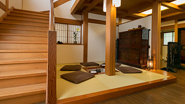 楽しい会話が弾む囲炉裏スペースや庭園を望む浴槽があり、一階二階の和室と洋室それぞれに分かれておやすみ頂くことができます。